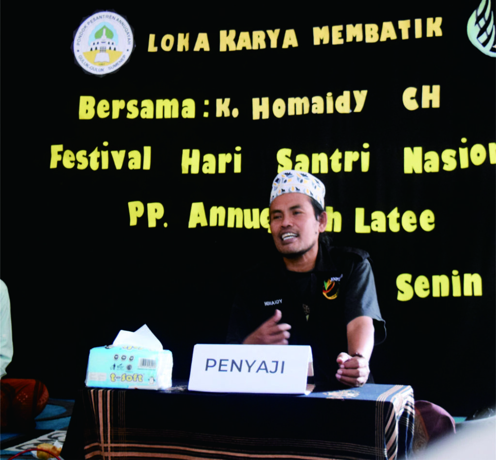 Tradisi membatik yang memang merupakan budaya asli Indonesia disadari betul oleh kalangan pesantren sebagai warisan Nusantara yang harus dipelihara. Oleh karena itu, pada momen FHSN 21 Lokakarya Membatik diadakan yang dibimbing langsung oleh K. Humaidi Ch. dari Sabajarin pada Senin (25/10). Ahmad Fajrul Azri Hidayat sebagai salah satu panitia menyatakan bahwa membatik harus tetap dijaga mengingat para pembatik di Madura mulai langka. “Hal penting lainnya yaitu perlu adanya regenerasi membatik, santri harus serba bisa, tidak hanya lukisan tapi juga membatik juga menjadi keunggulan pesantren.” Fajrul menambahkan bahwa batik setidaknya dapat menjadi program baru di Pesantren. “Setiap tahun pada Hari Santri harus ada hal baru sehingga Pesantren tidak hanya itu-itu saja, namun juga menjaga tradisi.” Pungkas Fajrul.